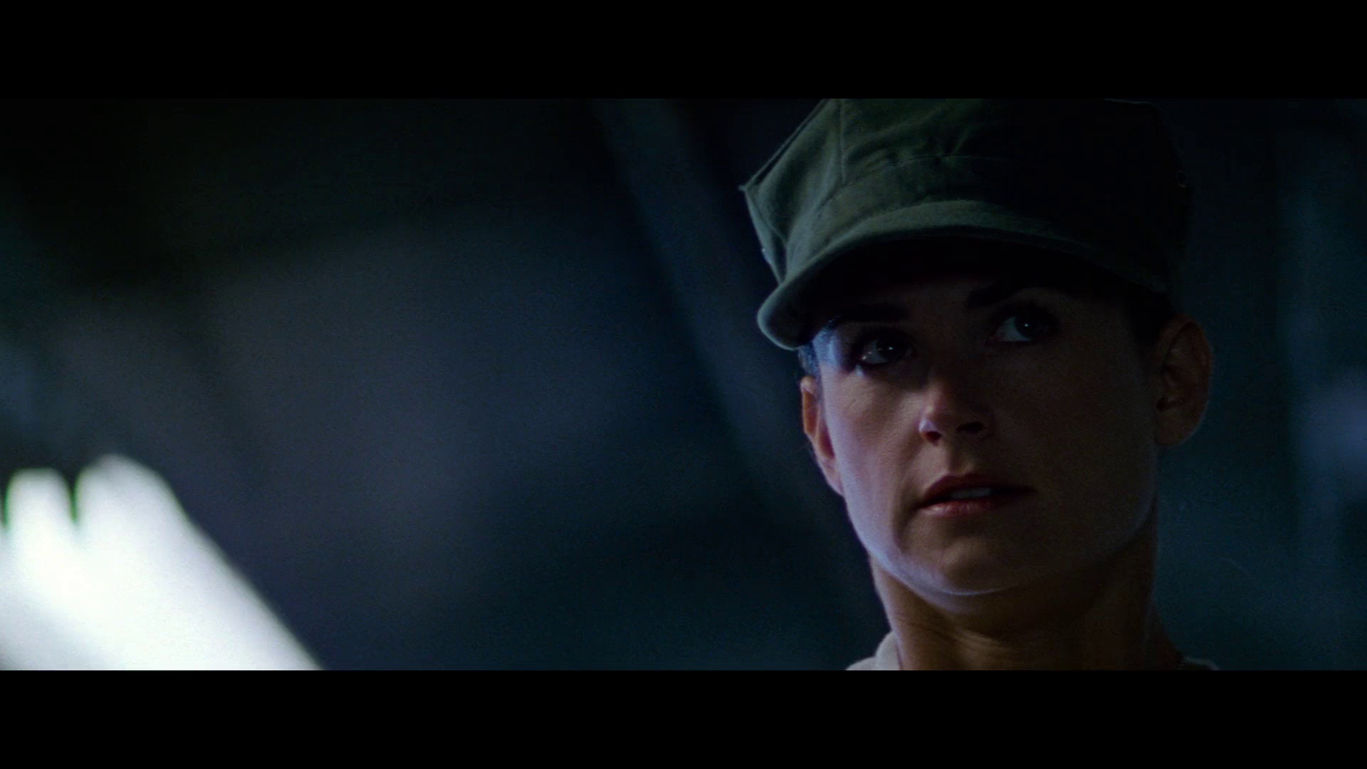 雷德利·斯科特在《魔鬼女大兵》中用近乎纪录片的手法呈现海豹突击队训练:黛米·摩尔饰演的欧尼尔需完成水下绑缚逃生、30公里负重行军等极限项目,镜头特写她磨破的指关节与结痂的膝盖时,观众能感受到肉体与体制碰撞的痛感。影片特意安排男性士兵朝她裸露身体羞辱,这段极具争议的戏份被摩尔用一句"我看到的只是解剖学差异"化解,凸显角色专业素养。 安妮·班克罗夫特塑造的政客狄海雯堪称全片最大反派,她将女性平权运动异化为政治工具,在听证会上假意支持欧尼尔时,嘴角的微妙抽动暴露虚伪。当训练官(维果·莫腾森饰)怒吼"这里不是女权实验场"时,军事基地锈蚀的铁丝网与灰蓝滤镜强化了压抑氛围,这种视觉语言比台词更尖锐地揭示体制排斥。 影片动作设计带有90年代硬核特质:欧尼尔在最终实战中徒手制服恐怖分子的段落,采用一镜到底拍摄,摩尔提前四个月进行以色列格斗术训练的效果得到展现。但杜比视界版本中某些夜间场景存在色阶断层,建议用OLED设备观看以保留暗部细节。需注意片中包含模拟水刑、断骨等写实画面,心理承受力弱者建议谨慎观看。 作为早期女性军事题材作品,剧本对军队官僚体系的批判比《拆弹部队》更直白,但缺乏《百万美元宝贝》的人物弧光。摩尔的表演值得肯定,但角色后期突然开挂的设定略显突兀。蓝光修复版特别收录了当年引发热议的剃发幕后花絮,这段实拍镜头让观众理解角色决绝的代价。