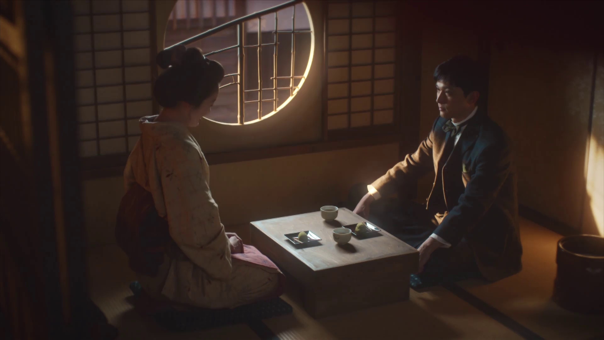 值得注意的是池胁千鹤客串的茶馆老板娘角色,她讲述的'盂兰盆节灯笼熄灭'传说成为影女故事的重要伏笔。这个仅出场7分钟的角色,其沧桑的京都腔与粗糙的和服腰带细节,暗示了剧集对明治底层民众的考据深度。福地美晴饰演的女工角色虽未直接出场,但通过书信内容推动了主线发展——这种留白手法正是本剧标志性叙事特色。