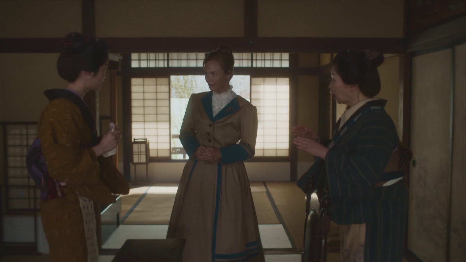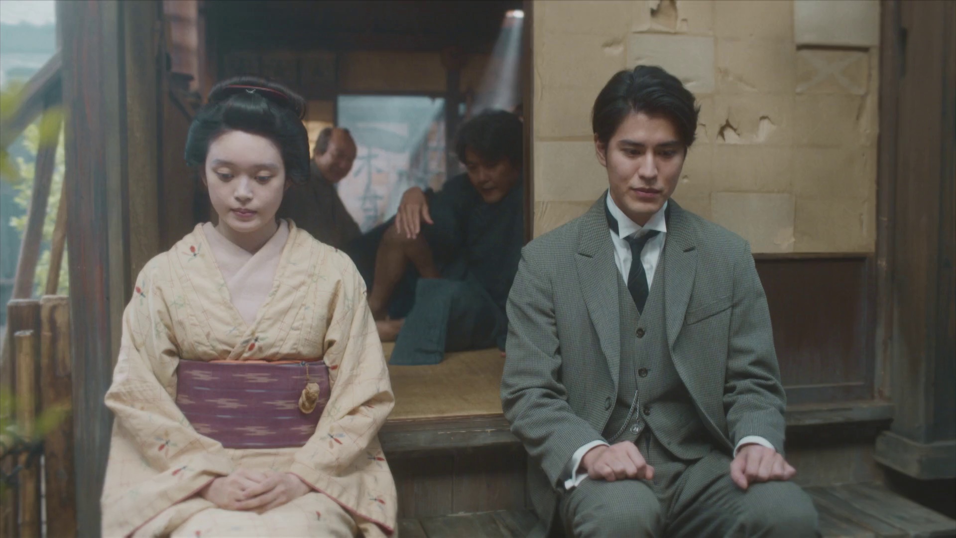 第63集聚焦松野时(高石明里 饰)发现丈夫八云(托米·巴斯托 饰)私自修改《雪女》传说的关键转折。当原本雪女因爱融化的人性化结局被改为西方式悲剧收场,松野时愤怒撕毁稿纸的场景,将明治时期文化认同的焦虑具象化。池胁千鹤饰演的艺妓阿稻作为传统怪谈守护者,在此集揭露了八云早期作品《无耳芳一》实为剽窃民间口述的真相。