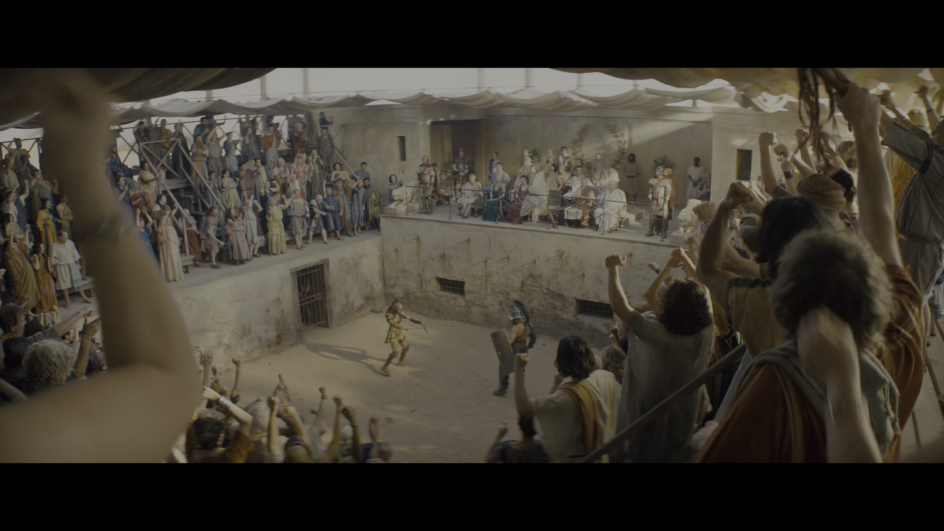 本集最大转折来自露西·劳莱丝饰演的贵族遗孀,她以捐赠武器为诱饵接近亚述,实则为亡夫复仇。训练场对决戏采用高速摄影与HDR高动态范围呈现,飞溅的血浆在4K画质下甚至能看到金属反光。值得注意的是乔·戴维森饰演的角斗士教练,其训练新奴隶时使用的三叉戟战术,明显沿袭自前作《血与沙》的经典战斗编排。